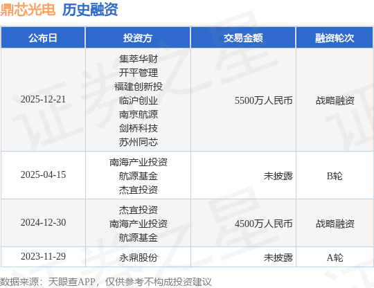 证券之星音讯,依据天眼查APP于12月21日发布的信息收拾,姑苏鼎芯光电科技有限公司战略融资,融资额5500万人民币,参加出资的组织包含集萃华财,开平办理,福建立异投,临沪创业,南京航源,剑桥科技,姑苏同芯。